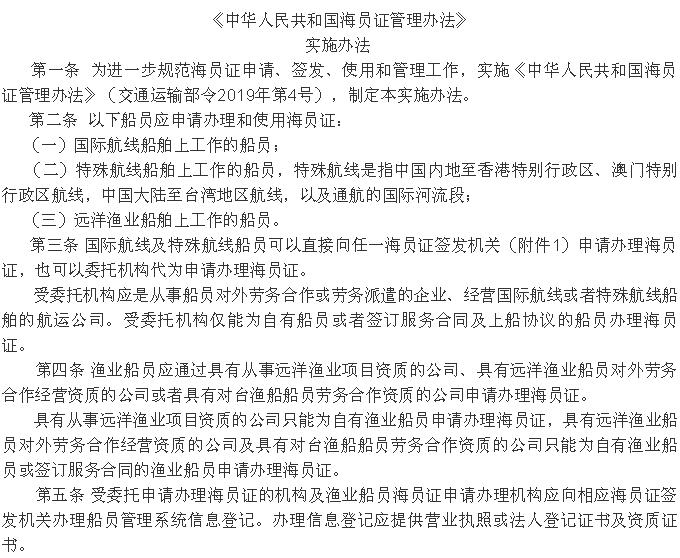 《<中華人民共和國(guó)海員證管理辦法>實(shí)施辦法》 2019年12月20日起施行!